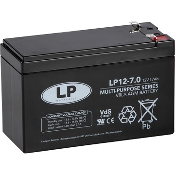 De VRLA AGM LP12-7 T1 VdS, 12 volt, 7 Ah, is een bedrijfszekere en veilige stand-by accu met AGM-technologie. Deze loodzuur LP12-7 T1 VdS accu is volledig gesloten en onderhoudsvrij en heeft een extra lange levensduur door de robuuste constructie van de accu. VdS gecertificeerd.
